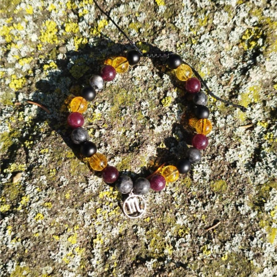 Bracelet signe astrologique "Scorpion". Combinaison de quatre perles la Labradorite, l'Agate noire, le Grenat et la Citrine, qui sont conçues pour s'associer aux traits de caractère des natifs du signe "Scorpion". La breloque "Scorpion" est en acier inoxydable.