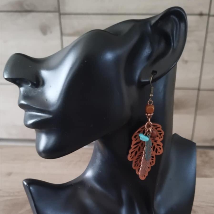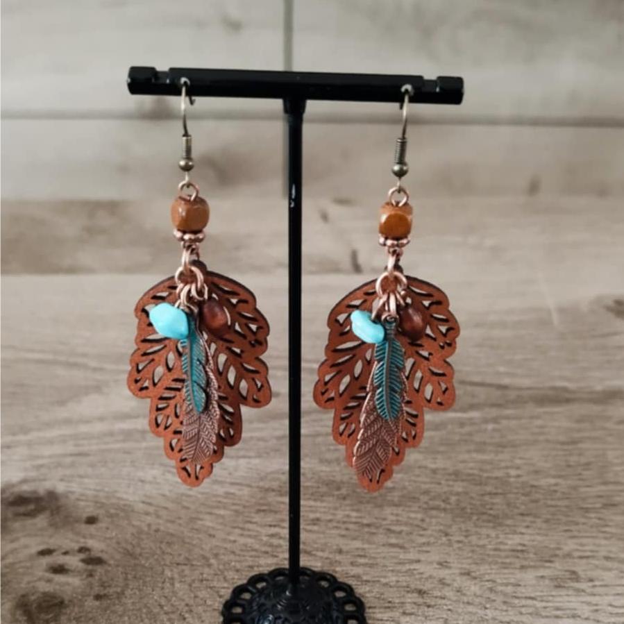 L’ensemble de la paire de boucle d'oreilles est en bronze, bois et cuir. Cette paire est réhaussée de breloques au ton turquoise.