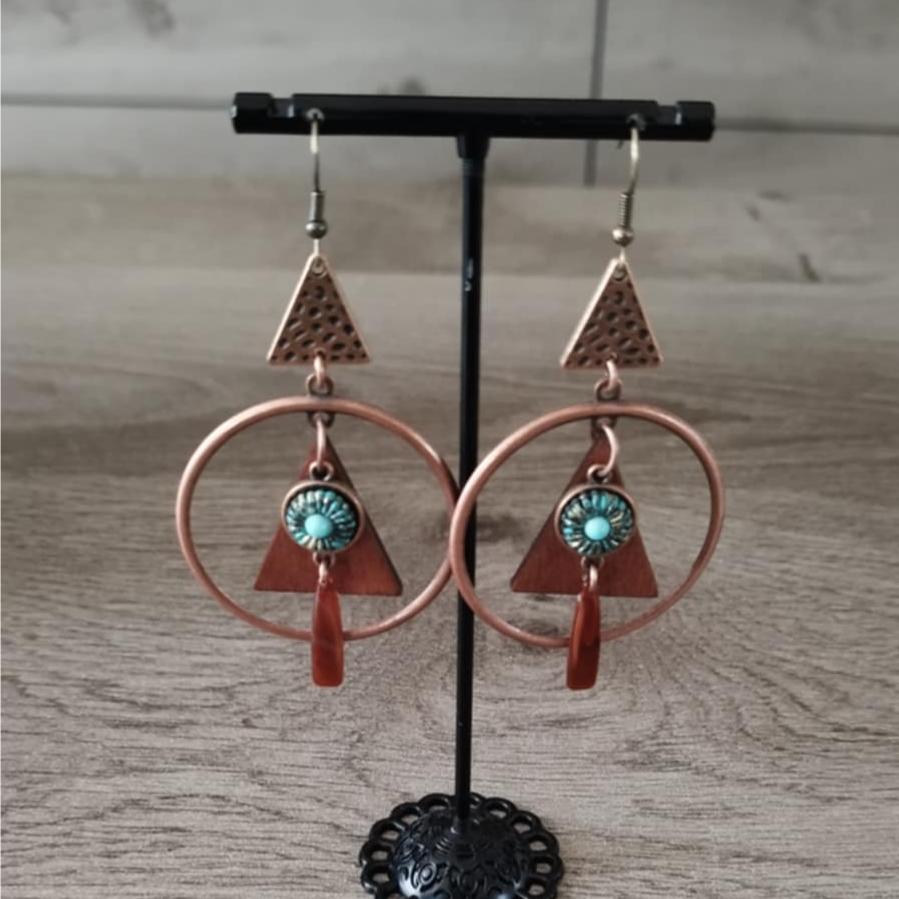 L’ensemble de la paire de boucle d'oreilles est en bronze et bois. Cette paire est réhaussée d'un cabochon au ton turquoise.