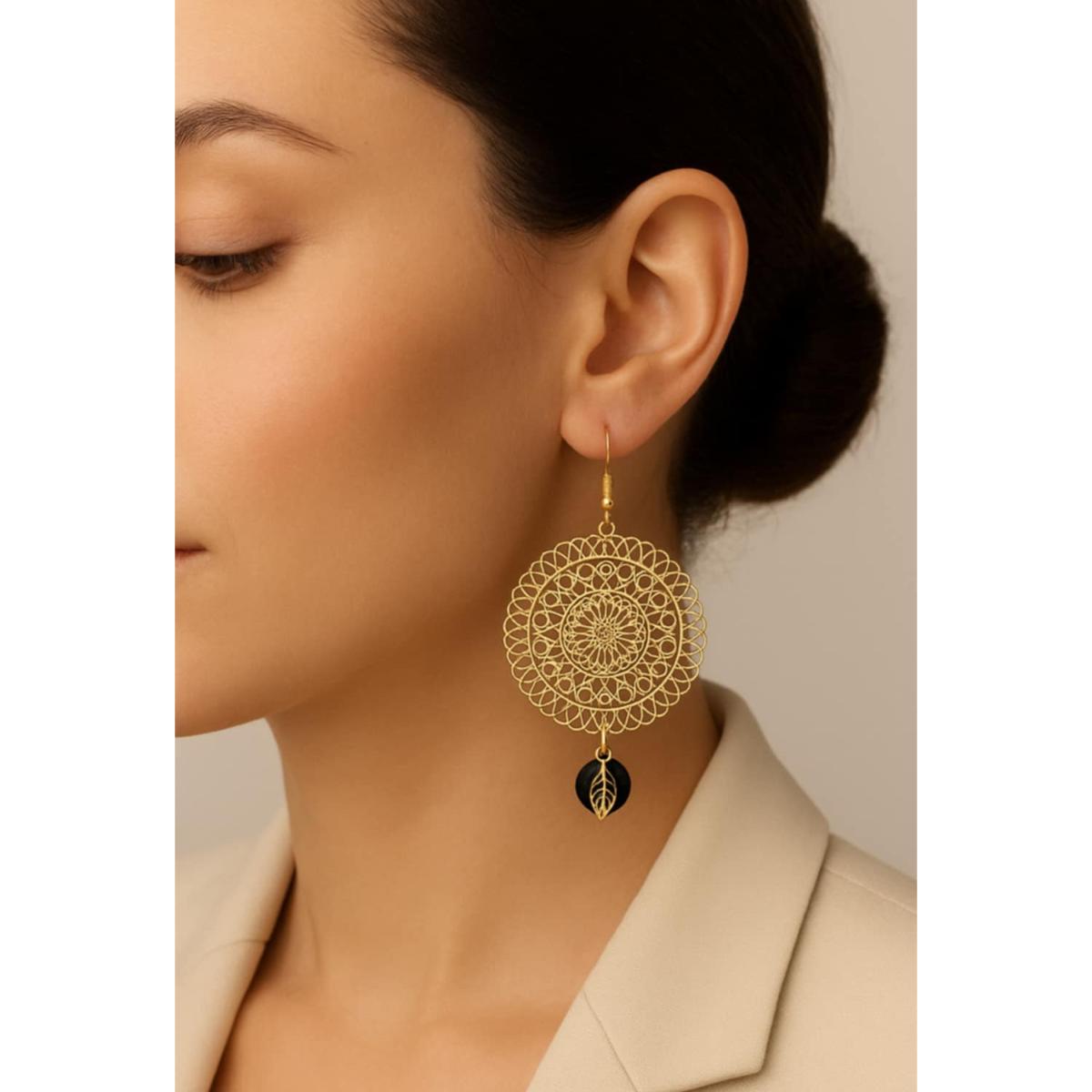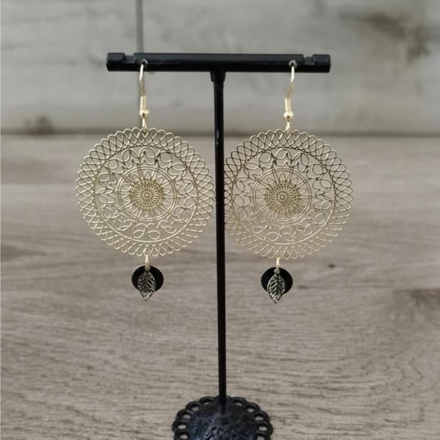 L’ensemble de la paire de boucle d'oreilles est en acier inoxydable et laiton peinte, elle est accompagnée de breloques de couleur noire.